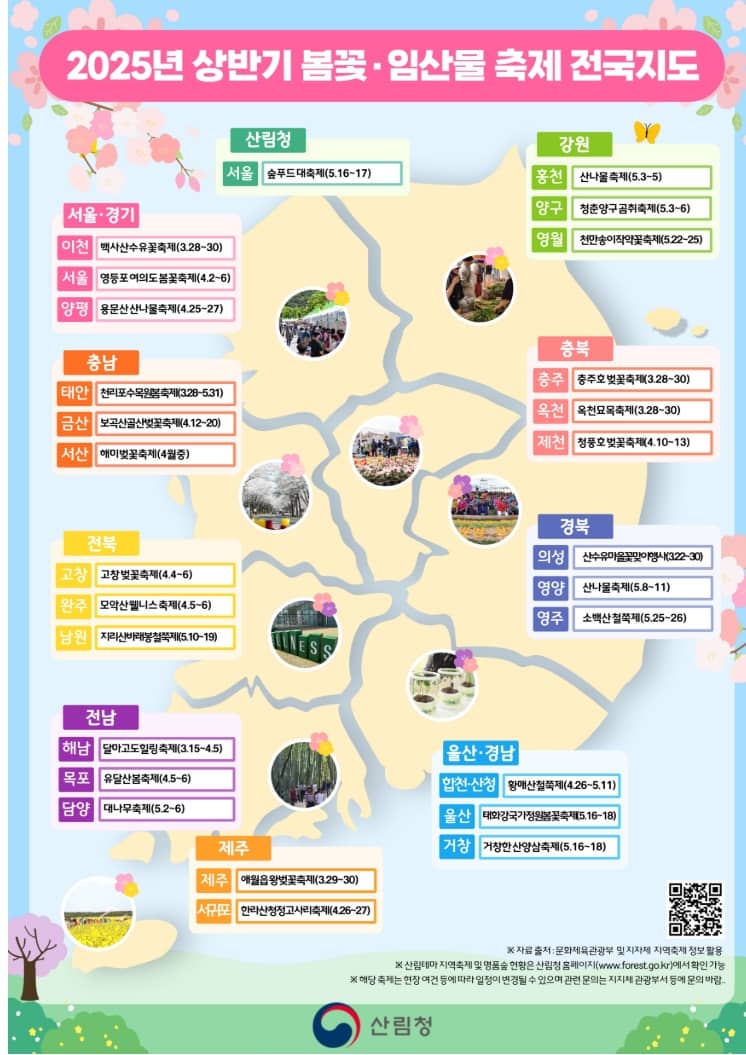 또한, 산림청은 '2025년 상반기 봄꽃·임산물 축제 전국지도'를 발간하여 전국의 꽃, 산·나무, 임산물 관련