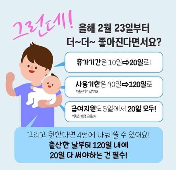- 출산 전후로 나눠서 사용하면, 출산 직전 배우자를 도와주고 출산 후에도 함께 육아할 수 있습니다.
